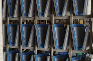 Chaque compagnon produit environ 80 carreaux par jour. À l’aide de biberons, les ouvriers remplissent les cloisons avec une agilité et une rapidité déconcertante. Hors de question d’oublier une alvéole, avant le passage à la presse. Certains ouvriers remplissent des moules avec plus de 25 alvéoles et 5 couleurs différentes, autant avoir de la méthode et de la rigueur.